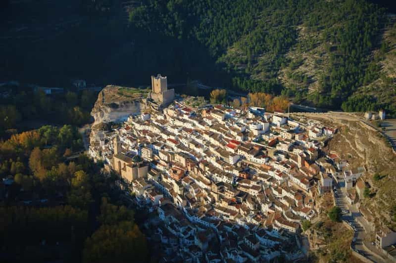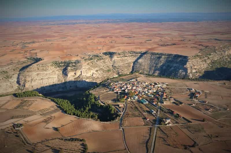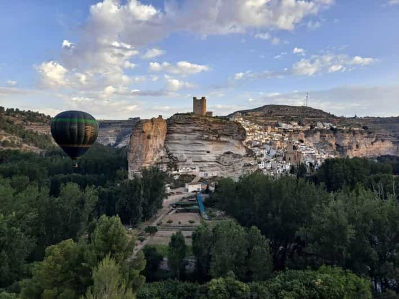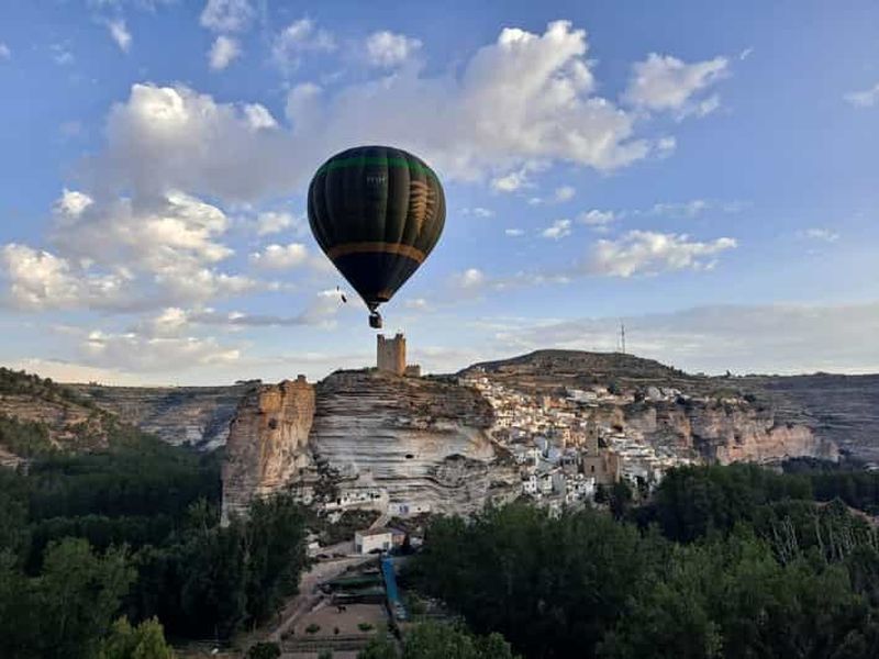 Survolez à l’aube la vallée du Júcar et Alcalá del Júcar avec un pilote expérimenté ; petit-déjeuner typique, toast, dip...