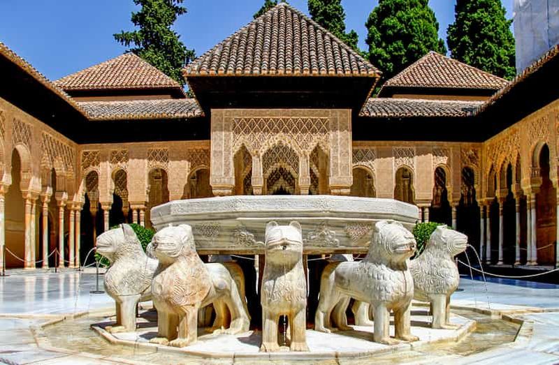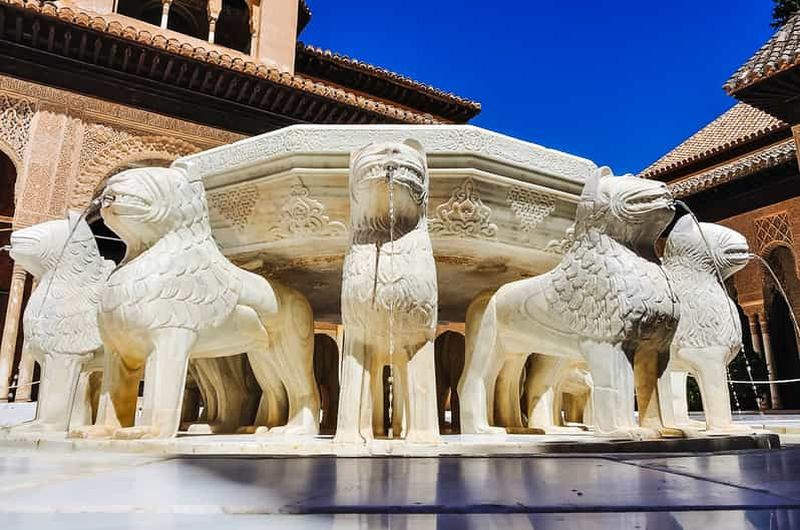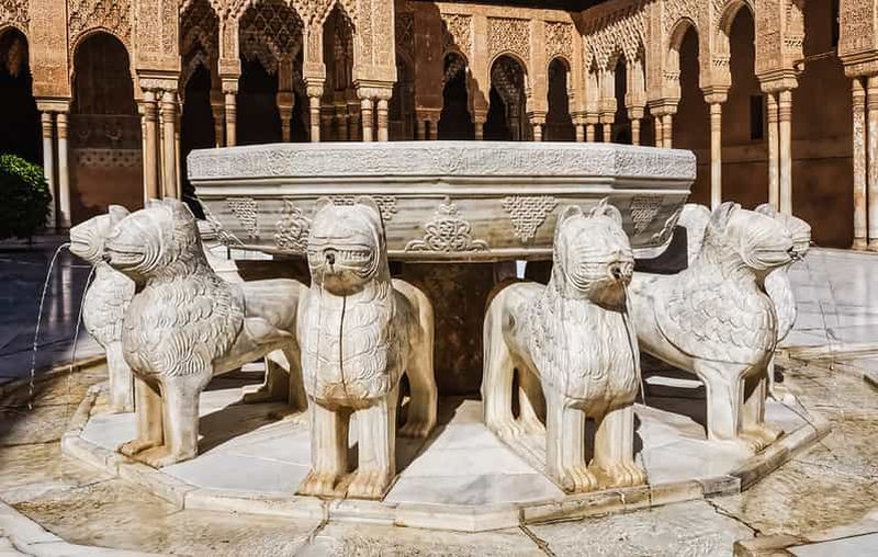 Au cœur de la Cour des Lions, douze statues de lion en marbre défient le temps, associées à de mystérieuses légendes. L’une d’elles raconte qu’ils reprennent vie sous la lumière de la pleine lune. Transition d’une sculpture à une réalité magique, selon la mythologie nasride, les lions protégeraient un trésor souterrain. Leur origine datant d’une période antérieure pourrait indiquer des influences artistiques judéo-chrétiennes, ajoutant à leur mystère.