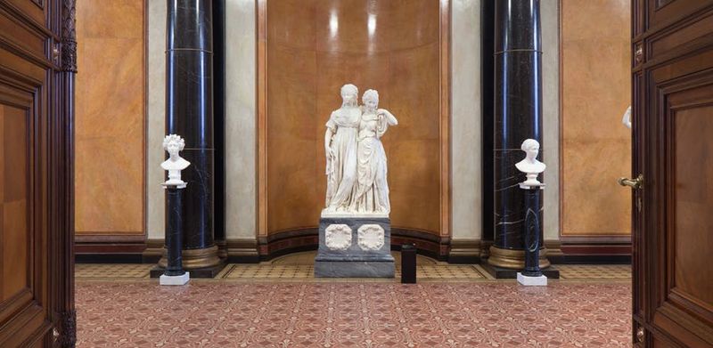 Trônant au sommet de l’escalier central, la statue équestre de Frédéric-Guillaume IV rappelle l’ampleur du soutien monarchique aux arts. Ce souverain prussien fut déterminant dans l’essor culturel de Berlin, encourageant de nombreuses initiatives artistiques. Son effigie illustre la place cruciale de la dynastie Hohenzollern dans le paysage européen.