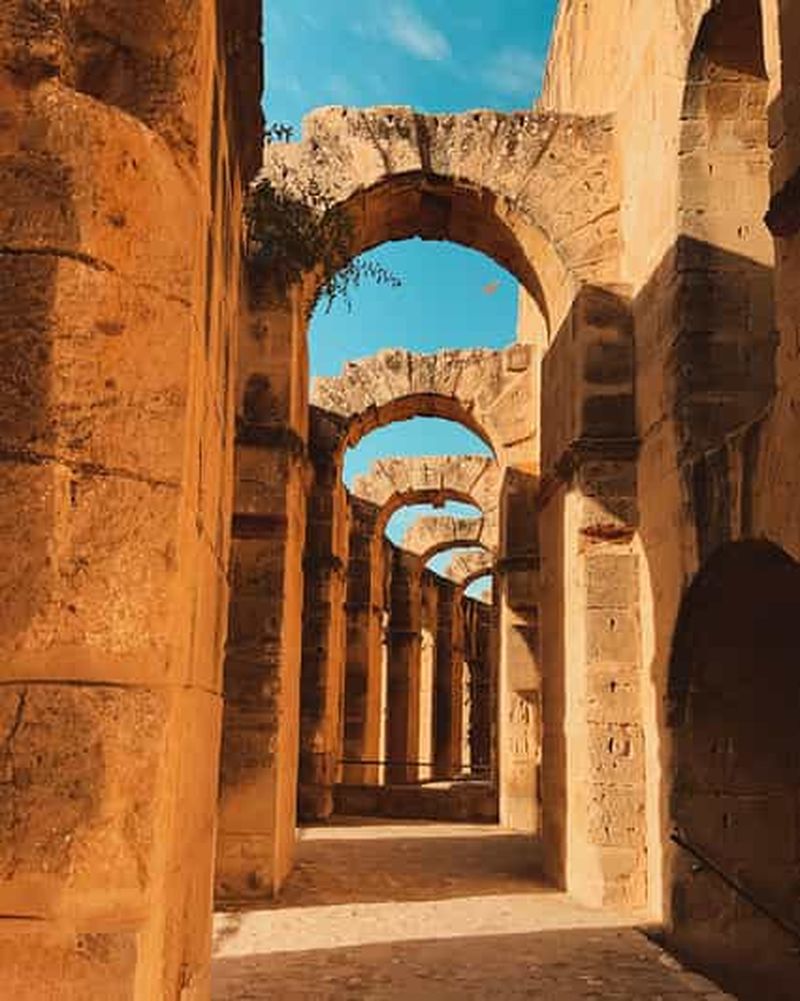 En grimpant vers les niveaux les plus hauts, vous profitez d’une vue à couper le souffle sur l’ensemble de l’édifice et sur la plaine environnante. Les Romains concevaient ces paliers supérieurs pour accueillir les classes populaires, permettant une vision d’ensemble de l’action au centre. Aujourd’hui, ce panorama révèle l’ampleur de l’amphithéâtre, la disposition de l’arène et la beauté du paysage tunisien, offrant un moment privilégié de contemplation et de photographie.