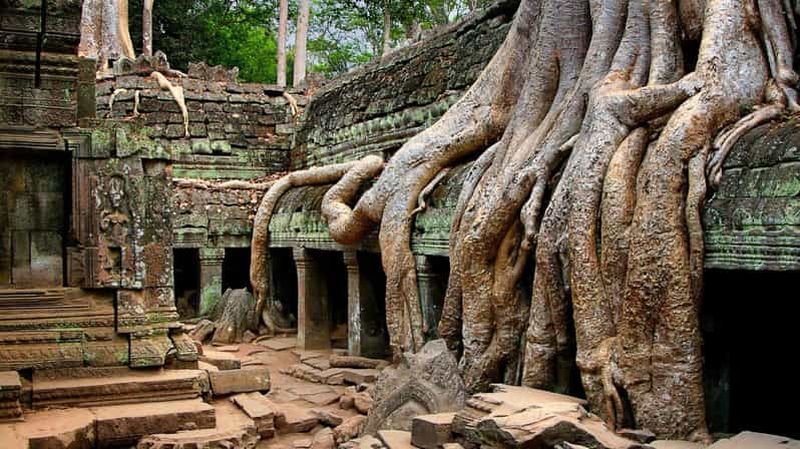 Édifié au XIIe siècle par Jayavarman VII, Ta Prohm est réputé pour son aspect inextricable, où la jungle a enveloppé les structures. Les arbres fromagers géants et les racines créent un décor unique, entre pierre et végétation. Les couloirs et les tours effondrées témoignent du passage du temps. Préservé dans un état proche de sa découverte initiale, ce site offre une expérience immersive au cœur de la nature et de l’histoire.
