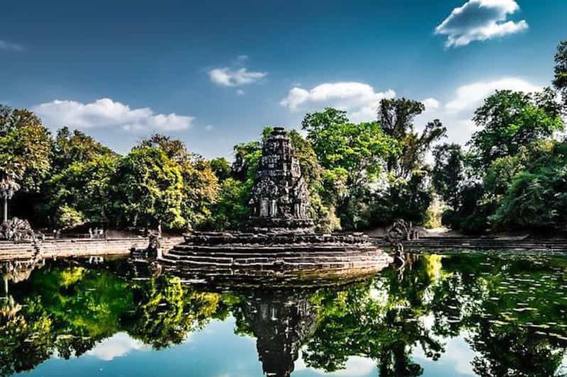 Neak Pean, un îlot circulaire érigé sous Jayavarman VII, se dresse au milieu du réservoir Jayatataka. Conçu comme un hôpital spirituel, ce temple bouddhiste était associé à la guérison des pèlerins. Sa structure principale, entourée de bassins, symbolise l’équilibre des éléments. Au centre, la tour s’élève au-dessus des nagas entrelacés. Chaque bassin secondaire représentait l’eau purifiante, vectrice de bien-être. L’atmosphère sereine du site en fait un lieu apaisant à découvrir.