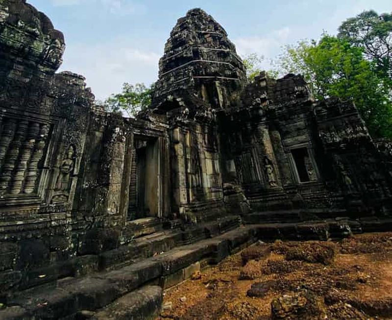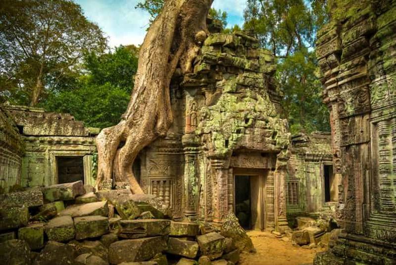 Édifié au XIIe siècle par Jayavarman VII, Ta Prohm est réputé pour son aspect inextricable, où la jungle a enveloppé les structures. Les arbres fromagers géants et les racines créent un décor unique, entre pierre et végétation. Les couloirs et les tours effondrées témoignent du passage du temps. Préservé dans un état proche de sa découverte initiale, ce site offre une expérience immersive au cœur de la nature et de l’histoire.