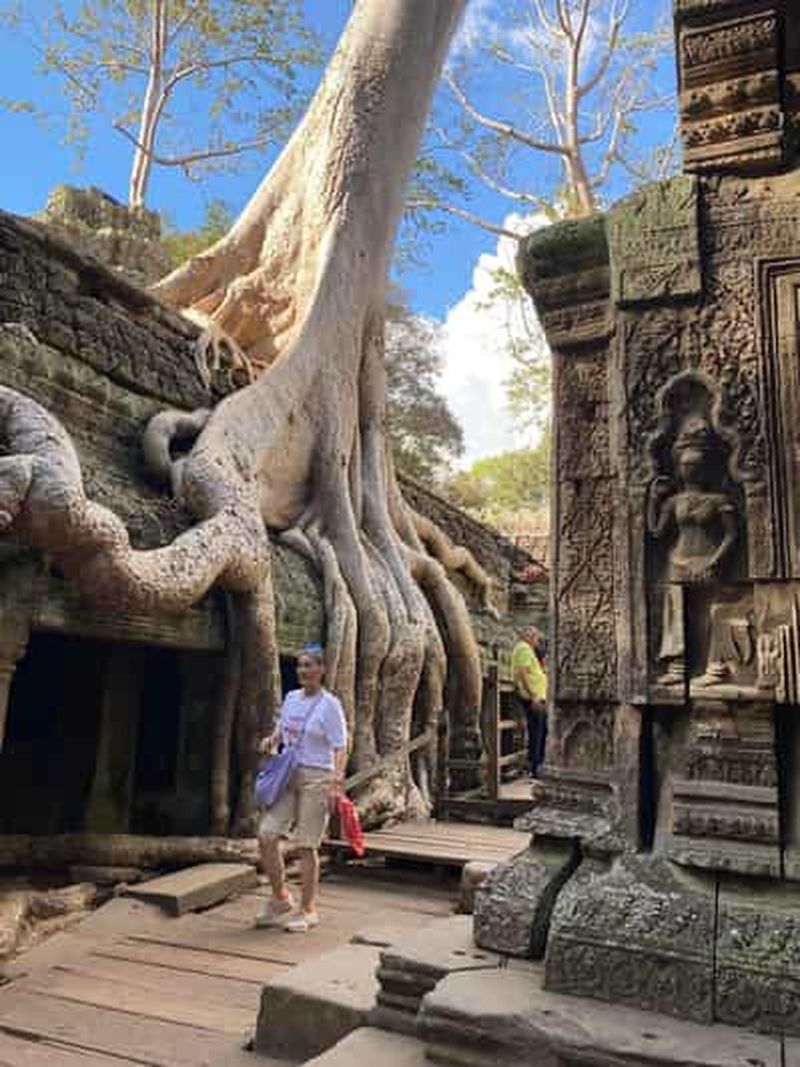 Édifié au XIIe siècle par Jayavarman VII, Ta Prohm est réputé pour son aspect inextricable, où la jungle a enveloppé les structures. Les arbres fromagers géants et les racines créent un décor unique, entre pierre et végétation. Les couloirs et les tours effondrées témoignent du passage du temps. Préservé dans un état proche de sa découverte initiale, ce site offre une expérience immersive au cœur de la nature et de l’histoire.