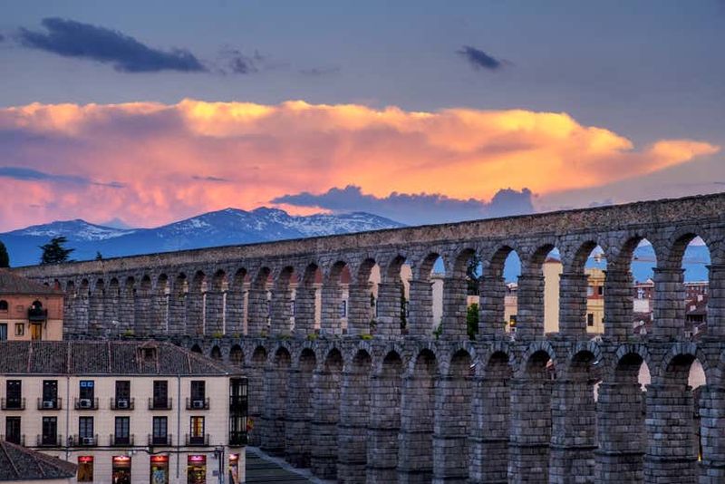 L’aqueduc de Ségovie est un témoignage impressionnant de l’ingénierie romaine, s’élevant majestueusement au-dessus de la ville depuis l’époque antique.