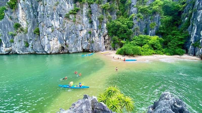 Les plages cachées de la Baie d’Halong se nichent souvent au pied des pitons calcaires, accessibles en kayak ou en petit bateau. Certaines n’apparaissent qu’à marée basse, révélant un sable fin et un environnement préservé. Ces refuges discrets offrent un calme incomparable, loin de l’agitation des zones fréquentées. Vous pourrez y nager dans des eaux claires ou vous détendre, bercé par le bruit léger des vagues et la beauté environnante.