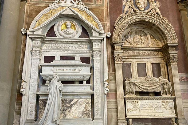 Abritant des personnalités illustres, la basilique Santa Croce est nommée le “Panthéon des Gloires Italiennes”. Vous y verrez les tombes de Michel-Ange (mort en 1564), de Galilée (1642), de Machiavel (1527) et du compositeur Rossini (1868), ainsi qu’un cénotaphe dédié à Dante. Par leur présence, ces monuments funéraires reflètent la grande admiration portée à ces personnages remarquables et invitent à explorer la riche histoire intellectuelle et artistique de Florence.