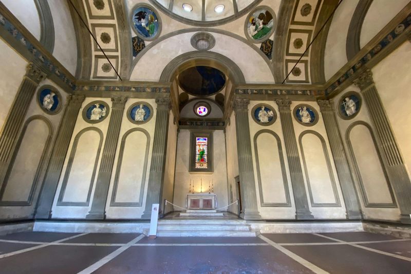 La Chapelle Pazzi, conçue par Filippo Brunelleschi vers 1441, est un bijou de l’architecture Renaissance. Située dans le premier cloître, elle brille par son plan harmonieux et ses proportions géométriques raffinées. La sobriété des décors met en valeur la rigueur mathématique chère à Brunelleschi. Des médaillons en terre cuite émaillée réalisés par Luca della Robbia agrémentent l’intérieur. Cette chapelle illustre l’esprit humaniste florentin et reste un modèle d’équilibre architectural.