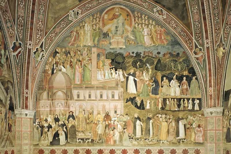 La Chapelle des Espagnols, ou Cappellone degli Spagnoli, fut commandée par la puissante couronne d’Espagne au XIVe siècle pour abriter les services religieux de sa communauté à Florence. Ses fresques monumentales sont réalisées par Andrea di Bonaiuto et abordent l’histoire de l’Église catholique. Les couleurs vibrantes et les scènes détaillées offrent un récit visuel captivant.