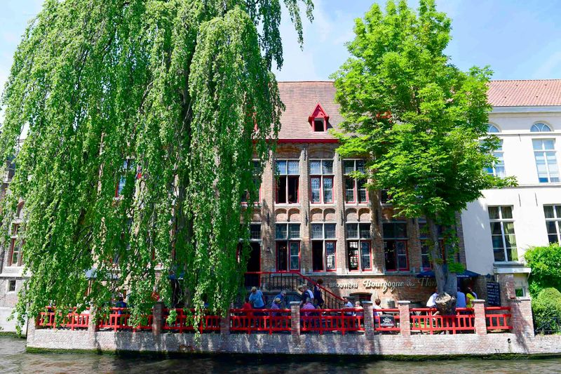 Perchée au-dessus des eaux tranquilles de Bruges, la terrasse de la brasserie offre une perspective unique sur les canaux historiques. Restaurée lors des travaux de modernisation de 2017, elle dispose de tables conviviales où vous pouvez savourer une bière fraîche tout en contemplant le ballet des bateaux touristiques.