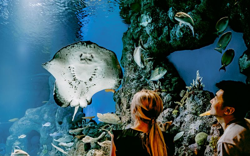 L’un des plus grands bassins de récif corallien de l’hémisphère Sud s’étend ici, permettant une immersion spectaculaire dans la biodiversité marine. À travers ses parois vitrées, vous observez poissons colorés et coraux vivants en pleine symbiose. Cette prouesse technique impressionne et sensibilise au rôle vital du récif local dans l’écosystème.