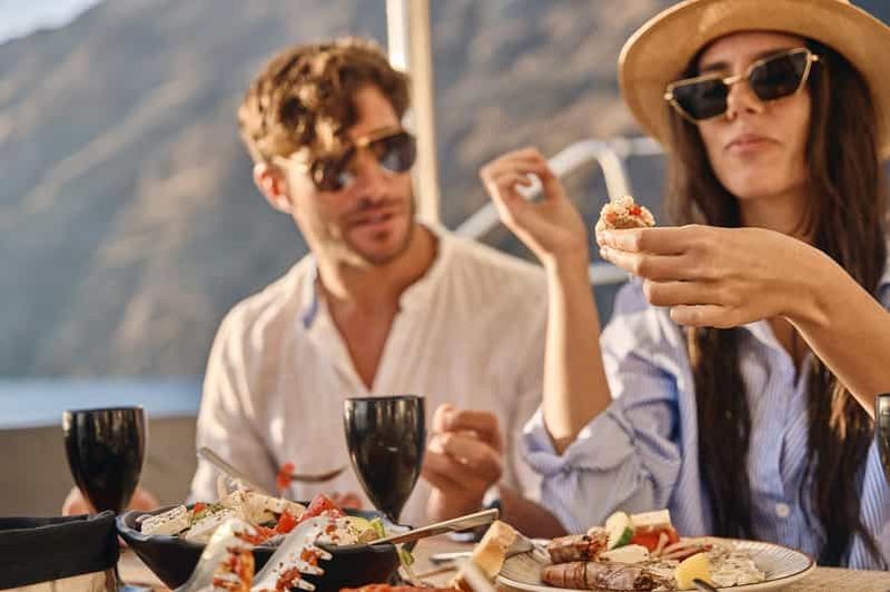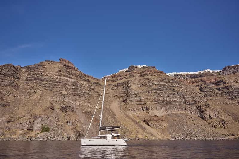 Explorez la baie de Santorin lors de cette croisière en catamaran. Faites de la plongée avec tuba au pied d'un volcan, d...