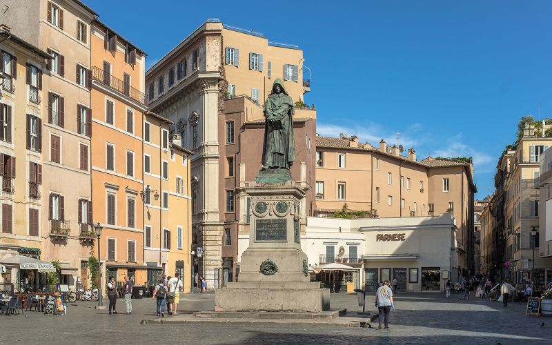 La statue du philosophe, érigée en 1889, se dresse au centre de la place en mémoire de son exécution pour hérésie en 1600. Financée par des libres-penseurs du monde entier, elle symbolise la lutte pour la liberté de pensée. Son regard tourné vers le Vatican interpelle toujours les visiteurs modernes.