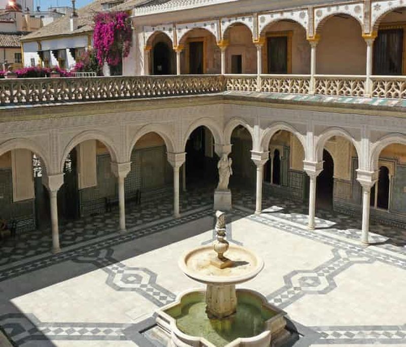 Le patio central, cœur de la résidence, fut conçu pour favoriser la fraîcheur durant les étés andalous. Entouré d’élégantes arcades et de colonnes en marbre, il offre un exemple remarquable d’harmonie architecturale entre styles Renaissance et mudéjar. Les arcs, finement travaillés, laissent entrer la lumière, révélant la beauté des azulejos. Dans cet espace convivial, la noblesse de Séville recevait ses hôtes, créant ainsi un lieu prestigieux pour les réceptions familiales.