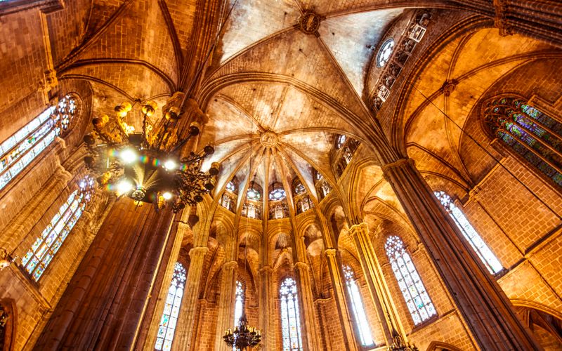 La nef centrale, culminant à plus de 25 mètres, impressionne grandement par sa hauteur et sa sobriété si typiquement gothique. Le chœur, orné de stalles sculptées du XIVe et du XVe siècle, témoigne du savoir-faire des artisans catalans. Dans les chapelles latérales, vous découvrirez diverses représentations saintes, dont certaines consacrées à des corporations médiévales. Ne manquez pas d’observer les clés de voûte finement décorées, qui racontent l’histoire spirituelle de Barcelone.