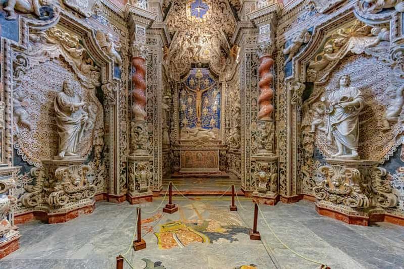 La chapelle du Crucifix, également appelée chapelle de la Croix, fut aménagée durant le XVIe siècle pour servir de lieu de prière privé. Elle abrite un grand crucifix en bois polychrome, œuvre qui suscite la dévotion. L’ornementation baroque se décline dans des fresques et stucs délicats, ajoutant une touche de faste à l’ensemble. Sa localisation privilégiée, près du chœur, en fait un espace religieux important dans le parcours de visite.