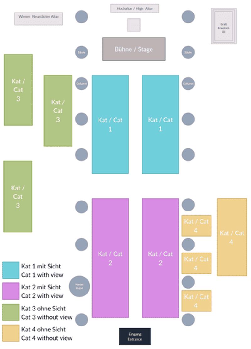 Sièges attribués sans vue sur la scène. Vous ne voyez pas l'artiste depuis ces sièges. La console de l'orgue se trouve au centre de la cathédrale. Écoutez un concert sur le nouvel orgue géant de la cathédrale Saint-Étienne de Vienne.