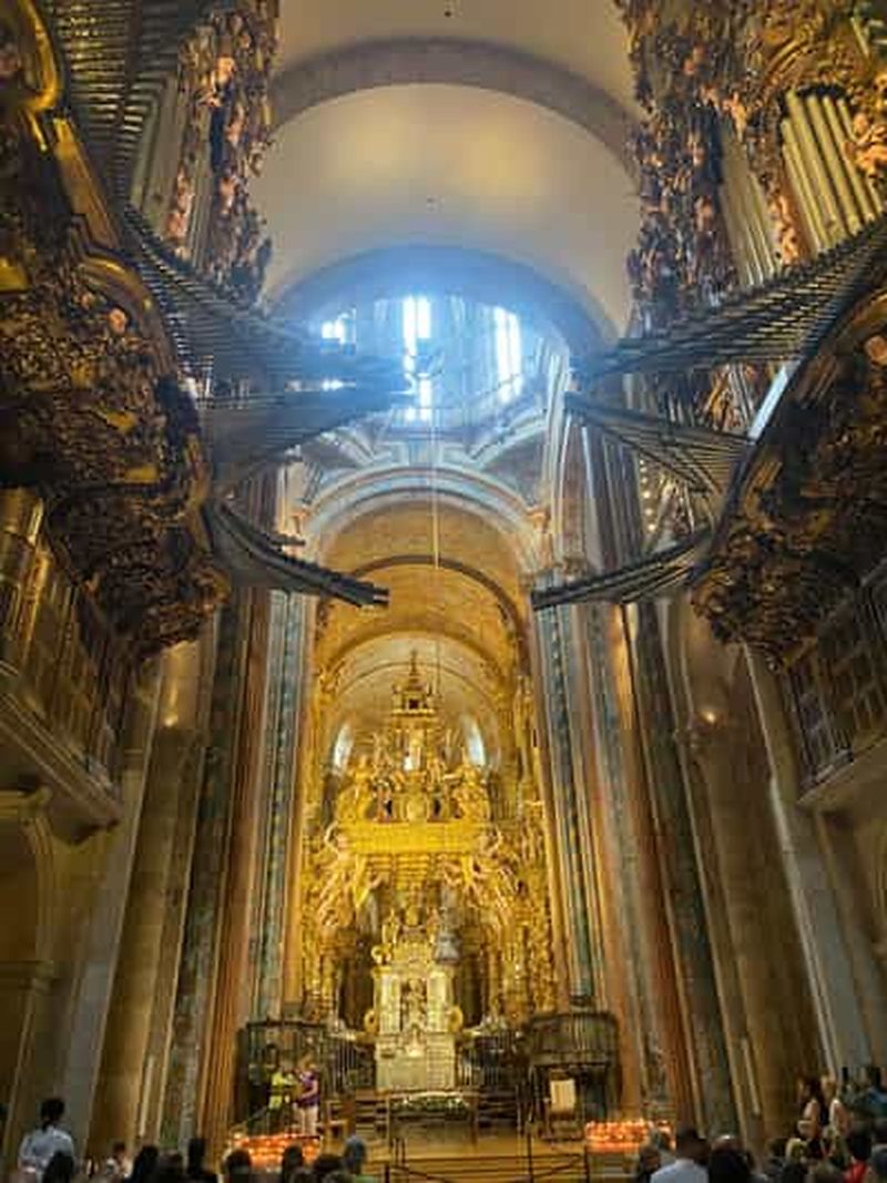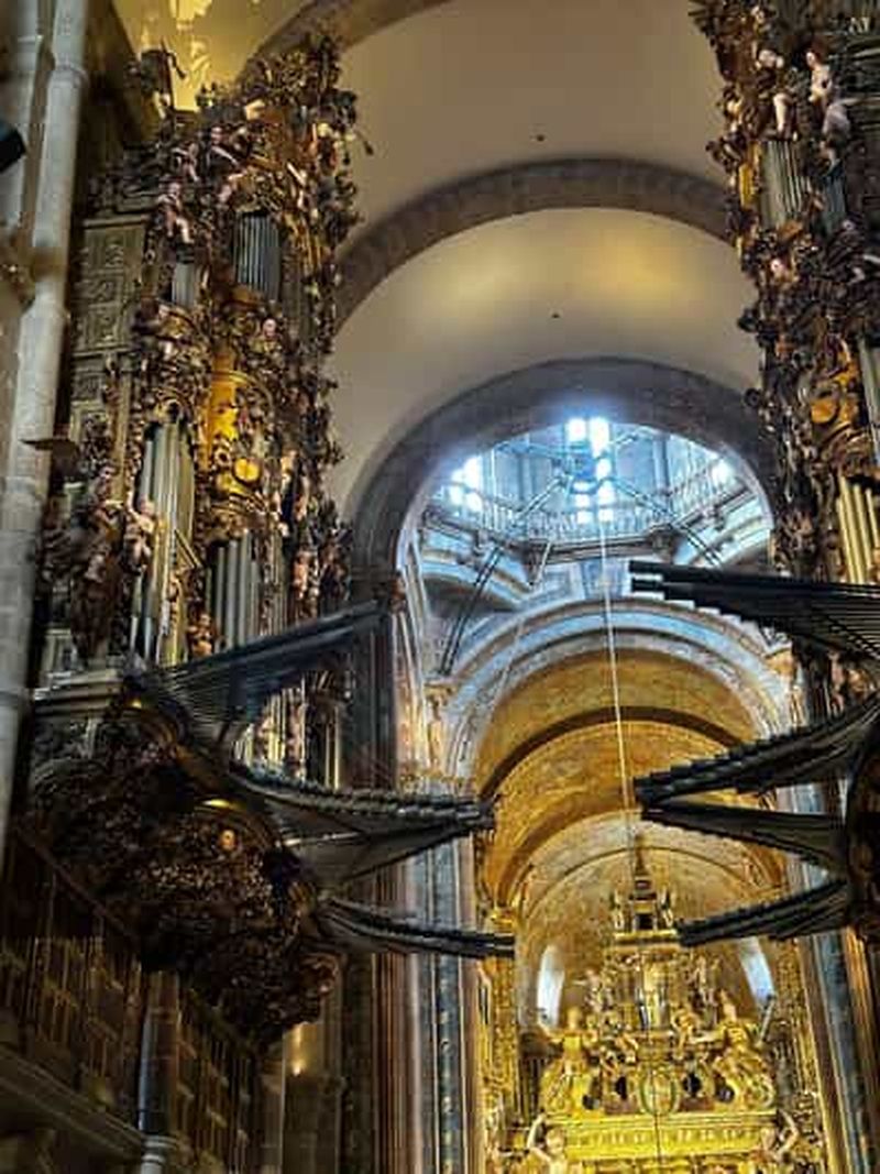 Le Botafumeiro, un encensoir en laiton argenté, peut atteindre 1,60 m de hauteur et un poids de 50 kg. Utilisé lors des grandes célébrations, il est suspendu à une poulie permettant un balancement spectaculaire au-dessus de la nef. Son usage remonte au Moyen Âge, époque où l’encens servait à purifier l’air face à l’afflux des pèlerins. Aujourd’hui, assister à son oscillation impressionnante constitue un moment fort de toute visite.