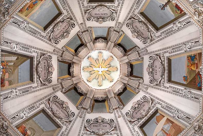 Consacré en 1628, l’édifice tel que vous le voyez résulte du génie de Santino Solari, qui imposa ici l’influence baroque au nord des Alpes. Les proportions majestueuses et les ornements fastueux incarnent la volonté de créer un monument d’exception, marquant une rupture avec l’architecture médiévale environnante, renforçant son prestige.