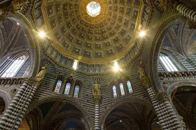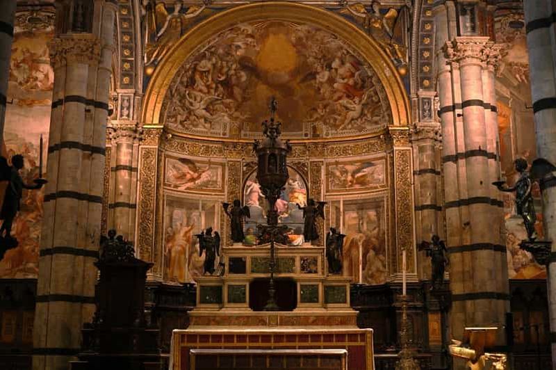 La coupole, conçue par l’architecte Domenico di Agostino au XIVe siècle, domine l’intérieur de la Cathédrale. Ses bandes alternées de marbre noir et blanc prolongent l’esthétique gothique toscane. Au sommet, vous apercevrez des fresques représentant la Gloire des Saints et des anges. Les jeux de lumière traversant les verrières ajoutent une atmosphère solennelle au matin. Profitez de cette vue pour comprendre l’équilibre entre architecture et art qui caractérise cet édifice.
