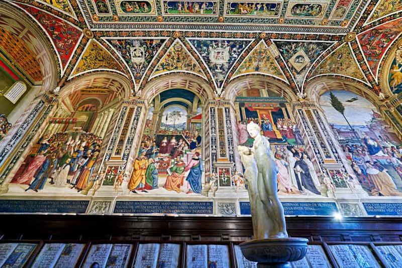 La Bibliothèque Piccolomini, édifiée au début du XVIe siècle, rend hommage au cardinal Francesco Piccolomini devenu le pape Pie III. Son décor somptueux est signé du Pinturicchio, qui y a peint des fresques colorées retraçant la vie et les triomphes du pape Pie II. Vous observerez aussi des livres anciens et des enluminures. Cet écrin raffiné, niché dans la Cathédrale, constitue une étape inoubliable pour tout passionné d’histoire et d’art.
