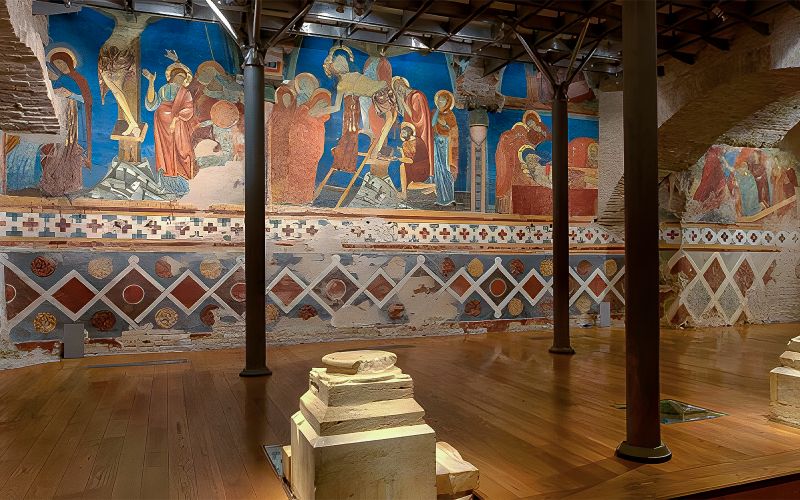 La Crypte de la Cathédrale, découverte lors de travaux en 1999, a révélé un ensemble de fresques médiévales préservées. Datant du XIIIe siècle, ces motifs colorés illustrent des récits bibliques, offrant un témoignage unique de l’art siennois de cette époque. Vous pourrez y apprécier la finesse des pigments et la science de la perspective. Située sous le chœur, cette partie secrète demeure moins fréquentée et réserve une immersion historique fascinante.