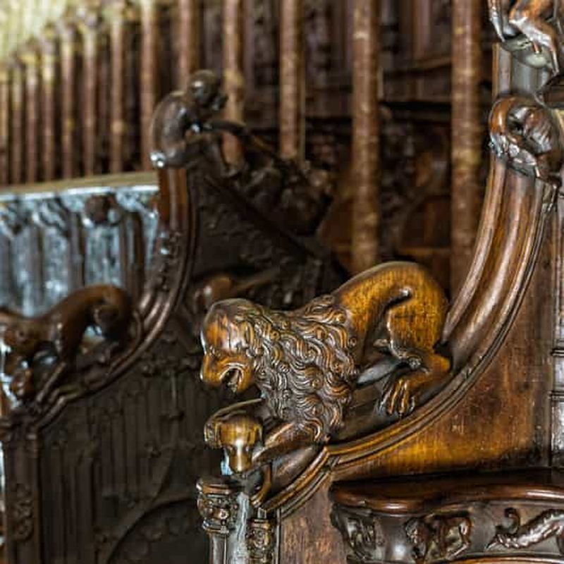 Le chœur de la Cathédrale, aménagé entre le XVe et le XVIe siècle, est réputé pour son ensemble exceptionnel de stalles en bois de noyer. Les sculptures, réalisées par des maîtres tailleurs flamands et castillans, représentent des scènes bibliques, des figures de saints et des événements historiques. Leur finesse révèle l’excellente maîtrise de l’artisanat de l’époque. Vous remarquerez également la délicatesse des miséricordes, rehaussements rabattables aux motifs arrangés avec un rare souci du détail.