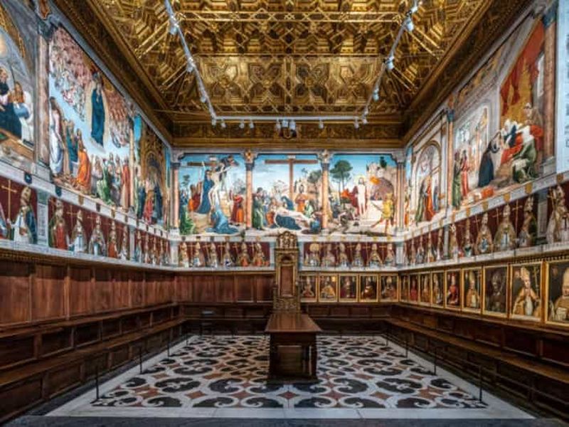 Lieu sacré pour les prêtres officiants, la sacristie est également un petit musée consacré aux grands maîtres de la peinture. Vous y découvrirez des toiles d’El Greco, de Goya et de Caravaggio, ainsi que des objets liturgiques anciens. Son architecture, plus sobre, s’efface devant la beauté des tableaux exposés. Les murs habillés de boiseries et la lumière feutrée créent une ambiance propice à la contemplation, vous plongeant dans une atmosphère de recueillement artistique.