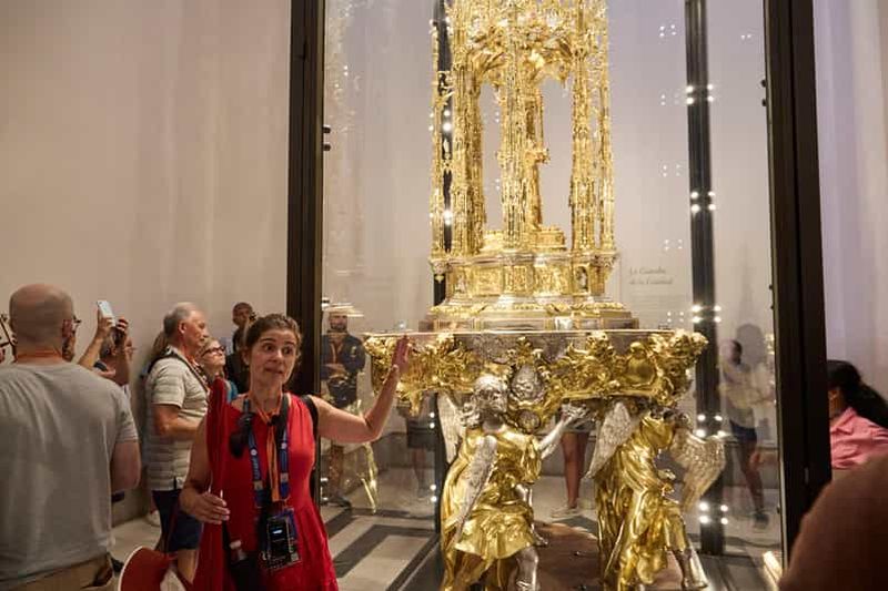 Le Trésor de la Cathédrale se trouve dans une salle fortifiée où sont conservés les objets sacrés les plus précieux. L’un des bijoux les plus admirés est la monstrance d’orfèvrerie, pièce monumentale créée au XVIe siècle puis enrichie au siècle suivant. Composée d’or, d’argent et de pierres précieuses, son raffinement témoigne de la maîtrise des artisans de l’époque. Les visiteurs peuvent y contempler calices, ciboires et reliquaires de grande valeur historique et artistique.