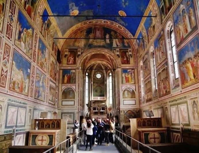 Le célèbre peintre Giotto fut chargé de décorer l’intérieur en 1303. Il créa une série de fresques racontant la vie de la Vierge et du Christ. Ces fresques sont reconnues pour leur utilisation innovante de la perspective et de la narration visuelle, ce qui fit de Giotto un précurseur de la Renaissance. Ses œuvres ici sont encore considérées comme une révolution artistique.