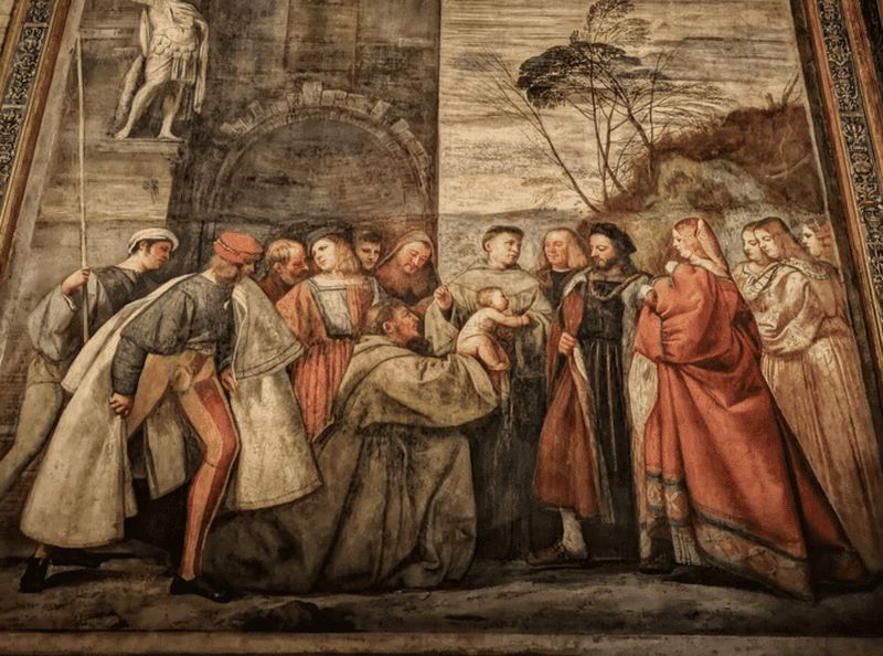 La Chapelle des Scrovegni a été commanditée par Enrico Scrovegni en 1300, acteur majeur de la vie sociale de Padoue. Scrovegni souhaitait racheter les péchés de son père, un usurier, en commissionnant une œuvre religieuse. La chapelle, dédiée à la Vierge Marie, visait à illustrer l’influence de la spiritualité dans l’art et la société médiévale.