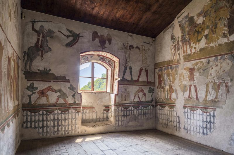 À l’intérieur du Château, de magnifiques salles renferment des fresques datant essentiellement du XIVe et du XVe siècle. Le style gothique prédomine, illustrant des scènes courtoises, religieuses et guerrières. Ces représentations colorées, commandées par les familles nobles résidentes, font revivre l’atmosphère de l’époque. Des motifs végétaux et figuratifs recouvrent les murs et les voûtes, ajoutant au charme enchanteur du lieu. Chaque recoin offre un aperçu de la sensibilité artistique médiévale.