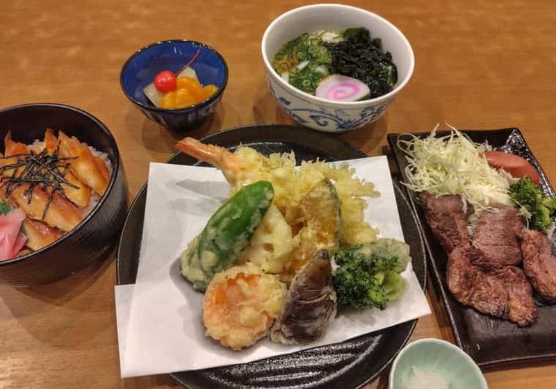 Choisissez cette option de repas (Senhime Gozen) Un délicieux repas japonais composé d'un mini bol de riz anago (congre), de mini udon chauds, d'un tendre mini steak, d'un assortiment de tempura et de fruits frais de saison - un équilibre parfait entre saveur et tradition.