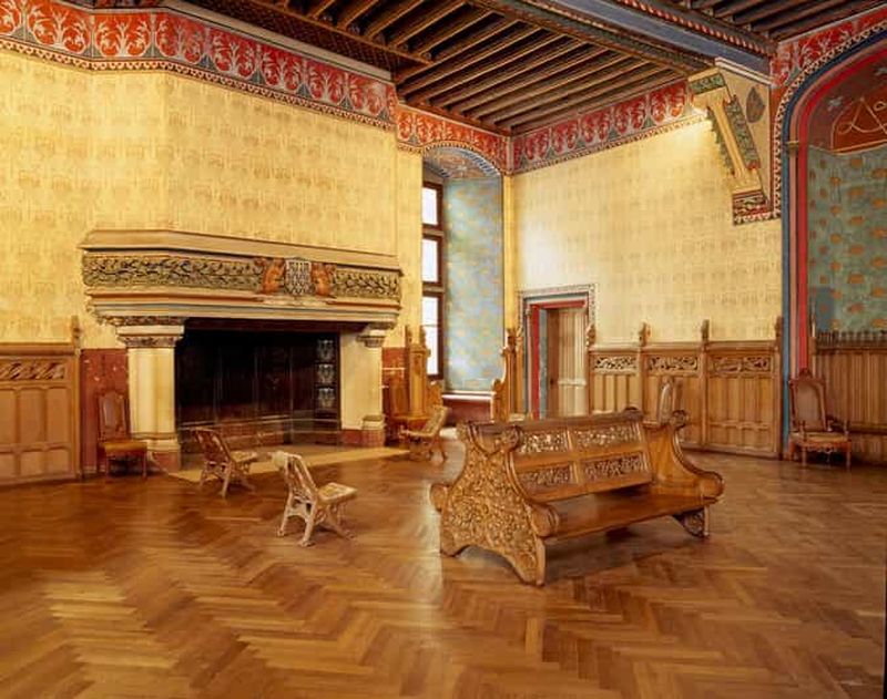 Le grand escalier mène à des salles d’apparat, dont la célèbre salle des Preuses, conçue pour rendre hommage à des figures emblématiques. Vous admirerez des armures, des fresques et des boiseries. Toutes reflètent la volonté de Viollet-le-Duc de restituer l’esprit chevaleresque. Les appartements impériaux, préparés pour Napoléon III, révèlent un mobilier soigné pour illustrer l’ambition du Second Empire.