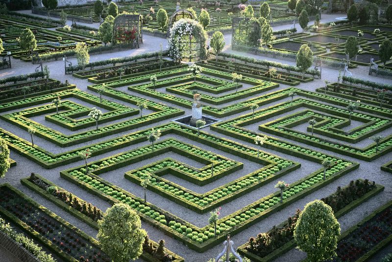 Les somptueux jardins de Villandry, reconstruits au début du XXe siècle par Joachim Carvallo selon l’esprit Renaissance, s’organisent autour du potager décoratif, du jardin d’ornement, du jardin d’eau et du jardin du Soleil. Entre plates-bandes géométriques et motifs symboliques, vous parcourrez un tableau floral. Le labyrinthe, niché au cœur du domaine, ajoute une touche ludique à la promenade. Il invite petits et grands à se perdre dans un décor enchanteur.
