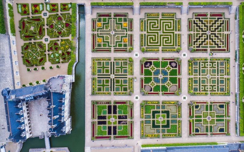 Les somptueux jardins de Villandry, reconstruits au début du XXe siècle par Joachim Carvallo selon l’esprit Renaissance, s’organisent autour du potager décoratif, du jardin d’ornement, du jardin d’eau et du jardin du Soleil. Entre plates-bandes géométriques et motifs symboliques, vous parcourrez un tableau floral. Le labyrinthe, niché au cœur du domaine, ajoute une touche ludique à la promenade. Il invite petits et grands à se perdre dans un décor enchanteur.