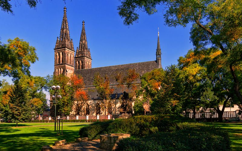 Rebâtie au XIXe siècle dans un style néogothique, la basilique Saint-Pierre-et-Saint-Paul domine les hauteurs de Vyšehrad. Ses tours élancées attirent immédiatement le regard, tandis que ses chapelles renferment des fresques d’une grande rareté. L’atmosphère solennelle du lieu est renforcée par les détails architecturaux, illustrant une époque de renouveau artistique remarquable.