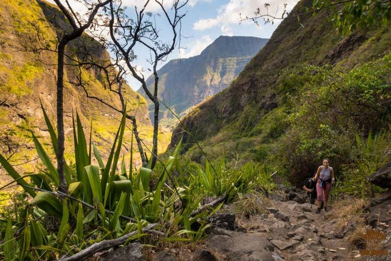 Le cirque de Mafate est un véritable paradis pour les randonneurs. Il abrite plus de 140 kilomètres de sentiers de randonnée aux parcours variés. Le Sentier Scout, datant du XIXe siècle, traverse des forêts primaires et relie Dos d’Âne à Aurère. La Canalisation des Orangers, construite pour acheminer l’eau, vous attend pour une balade panoramique au-dessus des ravines. Enfin, le Col du Taïbit, à plus de 2 000 mètres, constitue un accès spectaculaire vers Cilaos avec des perspectives absolument saisissantes.