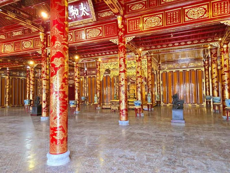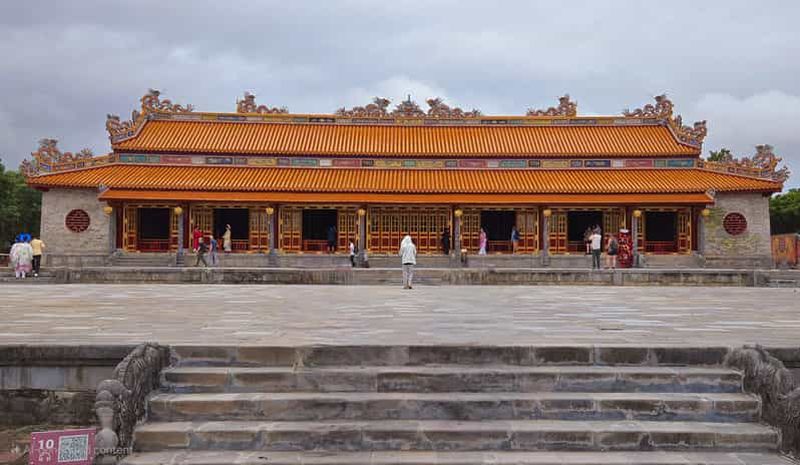 Pendant l’intronisation impériale, ce somptueux palais accueillait les cérémonies opulentes de la dynastie Nguyễn. Seule la famille royale et les mandarins d’élite pouvaient franchir ces portes. Vous admirerez ses décorations somptueuses, marquant la puissance symbolique du trône et l’importance des protocoles au Vietnam.