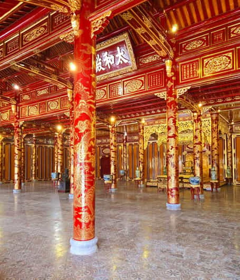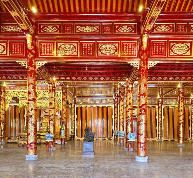 Érigé en 1805 sous l’empereur Gia Long, le Palais de l’Harmonie Suprême marquait le cœur cérémoniel de la Cité impériale. C’est ici que se tenaient couronnements et réceptions officielles. Son trône doré, symbole du pouvoir absolu, attire le regard. Vous y découvrirez des piliers décorés de dragons impériaux et des toitures finement sculptées. Le lieu conserve une atmosphère solennelle, reflétant l’importance politique et spirituelle de la cité impériale dans le royaume des Nguyễn.