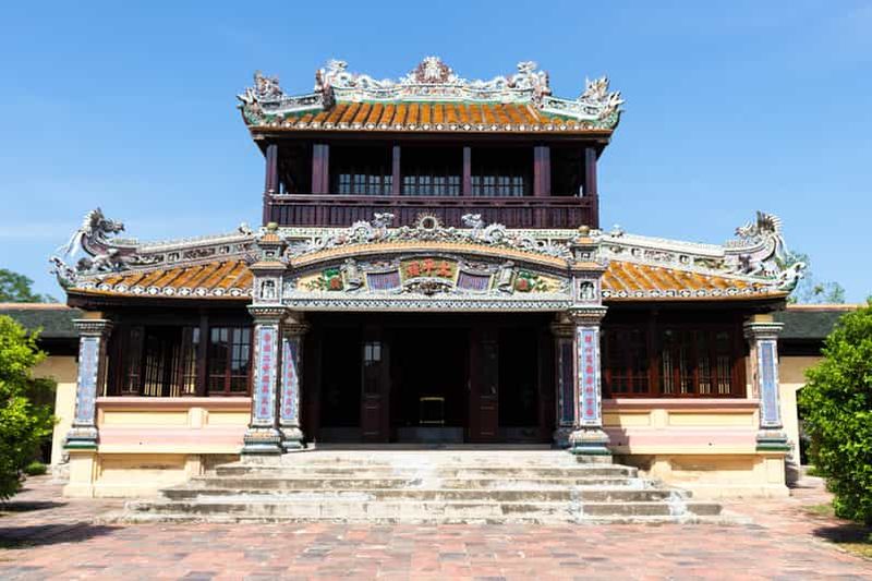 Pendant l’intronisation impériale, ce somptueux palais accueillait les cérémonies opulentes de la dynastie Nguyễn. Seule la famille royale et les mandarins d’élite pouvaient franchir ces portes. Vous admirerez ses décorations somptueuses, marquant la puissance symbolique du trône et l’importance des protocoles au Vietnam.