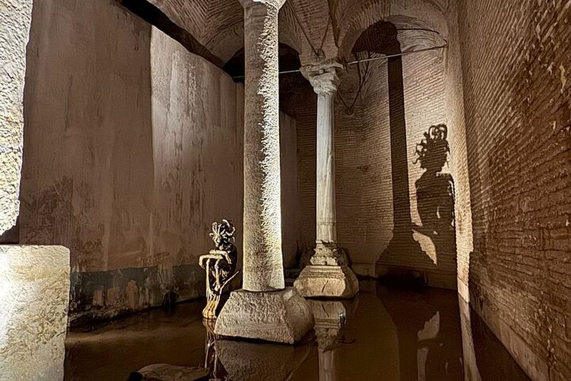 Deux imposantes têtes de Méduse, servant de base à des colonnes, suscitent toujours la curiosité quant à leur origine. L’une repose à l’envers, tandis que l’autre se retrouve inclinée, marquant symboliquement la neutralisation de leur pouvoir pétrifiant. Vous pourrez alors contempler ces sculptures légendaires, incontournables lors de votre visite souterraine.