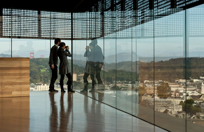 Perchée à environ 44 mètres de haut, la tour d’observation vous invite à profiter d’une vue époustouflante à 360 degrés. Simplement, balayez du regard la baie, le centre-ville, ainsi que l’immensité verdoyante du Golden Gate Park. Cette expérience immersive illustre parfaitement le dialogue entre l’art, l’architecture et le paysage californien.