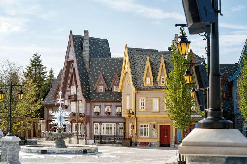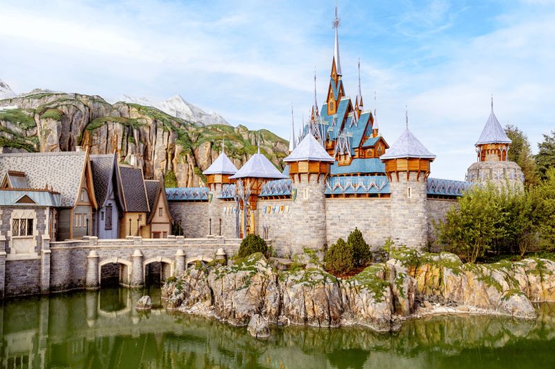 La silhouette emblématique du Château de la Belle au Bois Dormant s’inspire d’enluminures médiévales, notamment celles des « Très Riches Heures du Duc de Berry ». Vous constaterez des motifs et des couleurs évoquant un univers féérique, plongeant ce monument central dans une atmosphère inspirée de l’art gothique et renaissant.