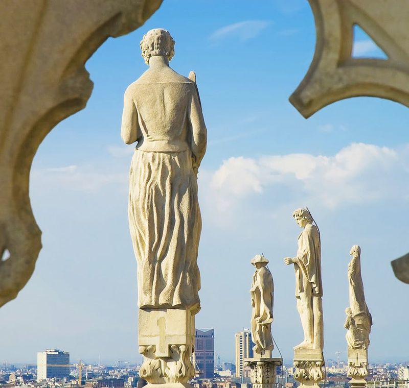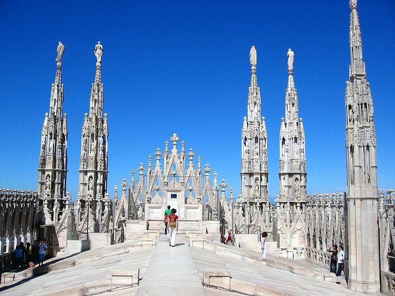 Découvrez une perspective unique sur les terrasses du Duomo de Milan, avec 135 flèches, la majestueuse Madonnina et plus de 3400 statues