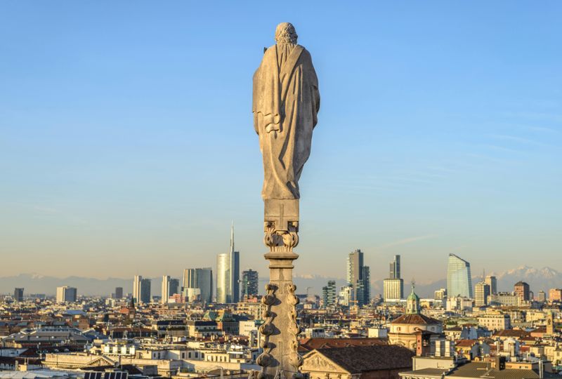 La statue de la Madonnina, haute de 4,16 mètres, brille sur la flèche principale depuis 1774, couvrant la ville de son influence bienveillante. Ses 3900 feuilles d’or illuminent le ciel milanais, la rendant immédiatement identifiable. Les habitants y voient un signe de protection et de fierté urbaine, et toujours rayonnante.