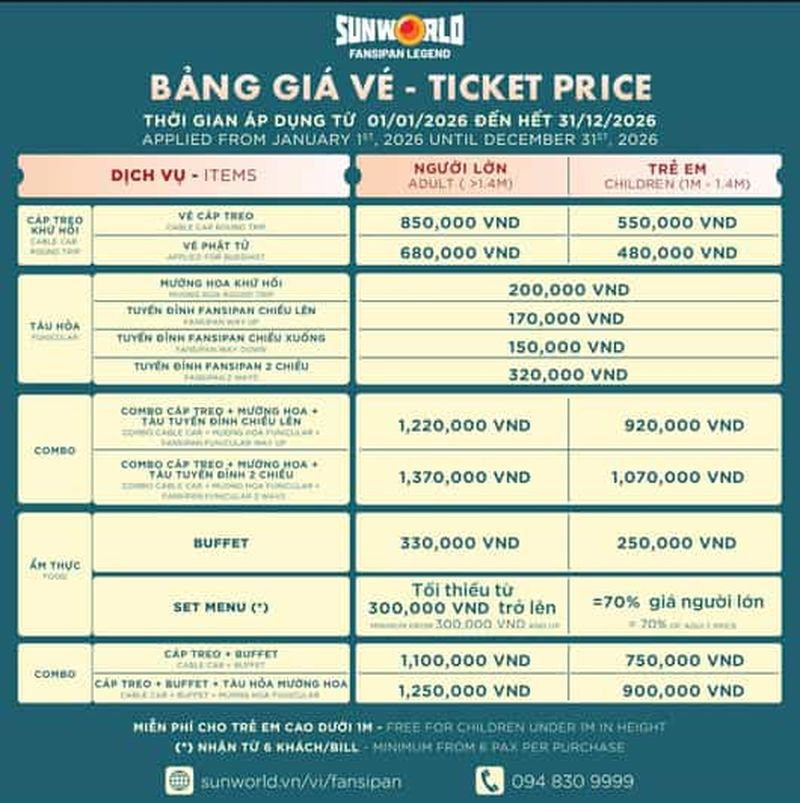 L'ACCÈS À FANSIPAN N'EST PAS INCLUS DANS LE PRIX DE L'EXCURSION. Le combo Fansipan (incluant le monorail, le téléphérique, le tramway et le déjeuner buffet) sera réservé à l'avance ; veuillez préparer 1 450 000 VND/personne (en espèces ou par carte) à régler à la billetterie le jour de votre visite.