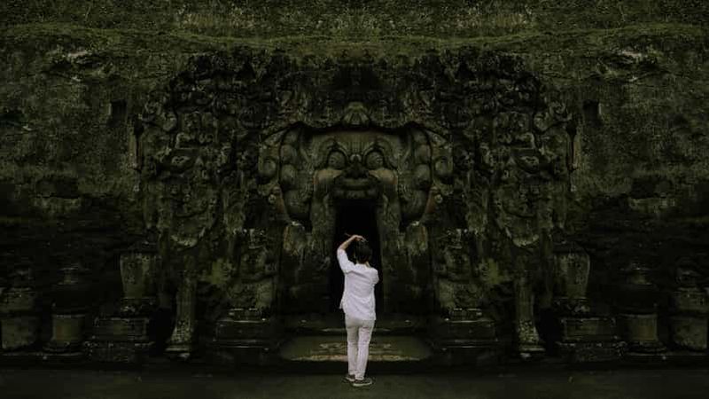 Dès votre arrivée à l’entrée sculptée de la grotte, vous serez frappé par l’iconique façade en forme de démon, gravée dans la pierre volcanique. Datée du XIe siècle, cette porte monumentale était sans doute destinée à repousser symboliquement les esprits maléfiques. Observez la complexité des motifs floraux et animaliers qui ornent la roche, signe du savoir-faire balinais.