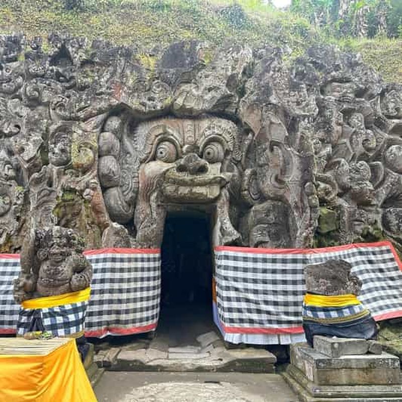 Dès votre arrivée à l’entrée sculptée de la grotte, vous serez frappé par l’iconique façade en forme de démon, gravée dans la pierre volcanique. Datée du XIe siècle, cette porte monumentale était sans doute destinée à repousser symboliquement les esprits maléfiques. Observez la complexité des motifs floraux et animaliers qui ornent la roche, signe du savoir-faire balinais.