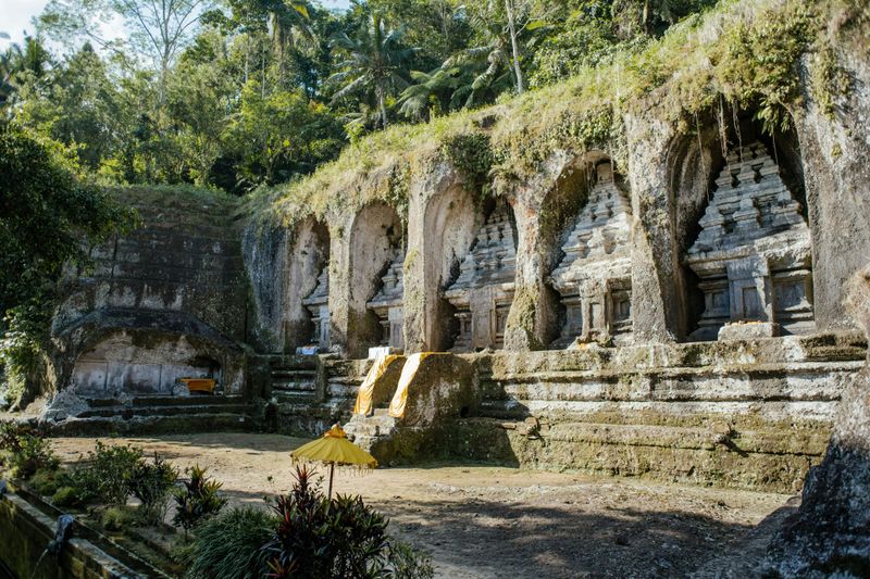 À l’arrière du site, vous découvrirez des fragments de stupas bouddhistes, révélant la cohabitation d’influences hindoues et bouddhistes au sein de Goa Gajah. Érigés sous le règne du royaume de Bedulu, ces éléments remontent au VIIIe siècle, bien avant l’édification de la grotte. Leur présence témoigne d’une tolérance religieuse historique et d’un brassage culturel unique à Bali.